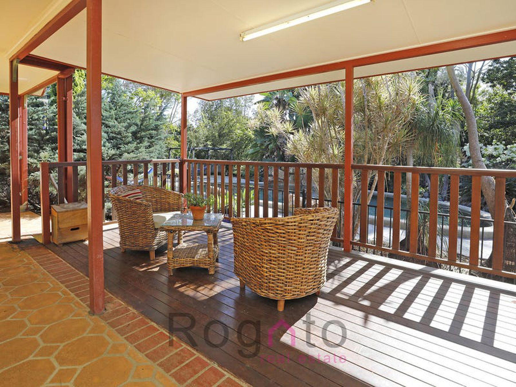 - Covered sitting deck overseeing the pool